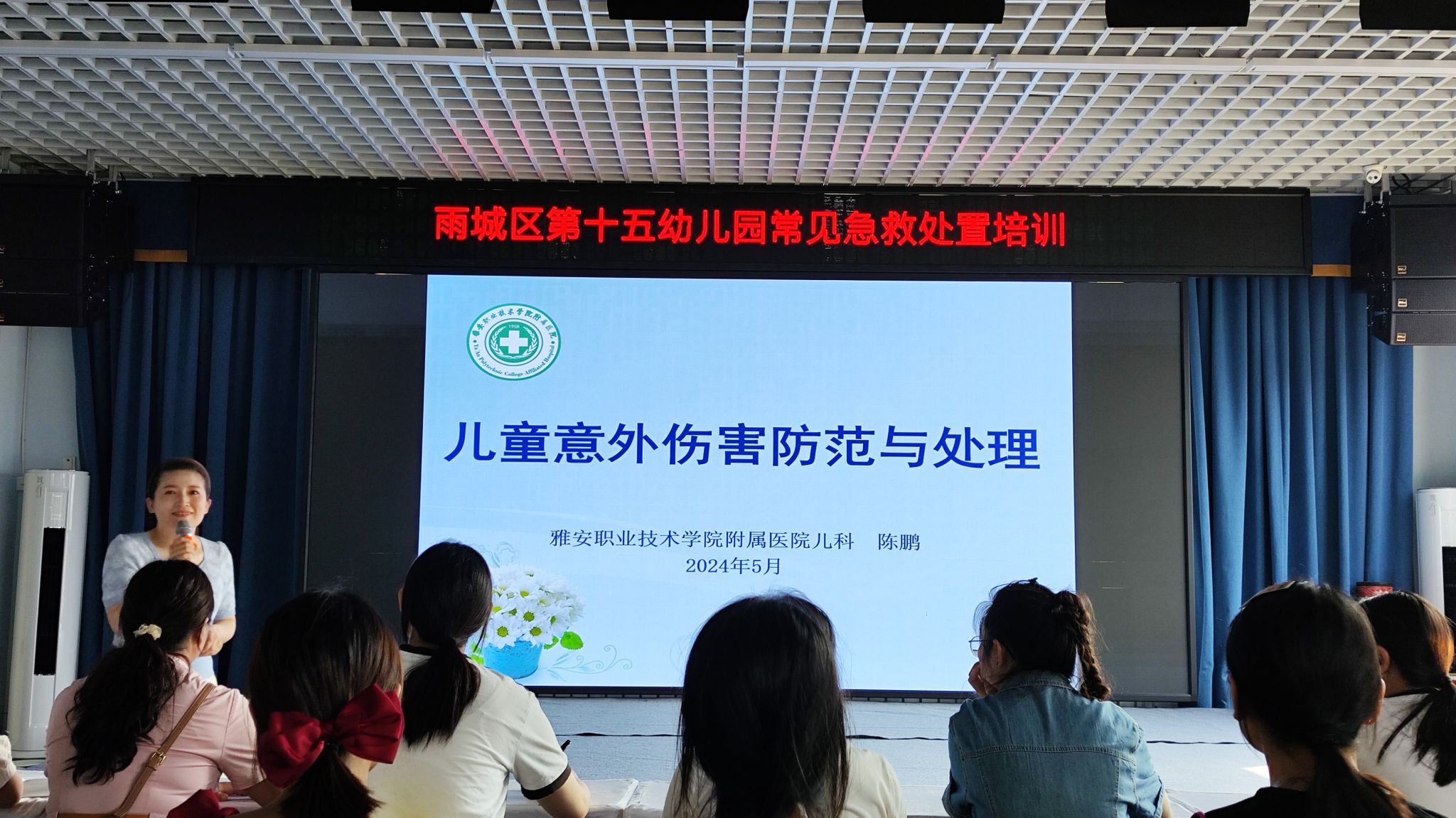 5月23日下午,应雅安实验幼儿园教育集团邀请,学校附属医院第一党总支第五党支部医护人员,走进雨城区第十五幼儿园,为雅安实验幼儿园教育集团(雨城区汉碑幼儿园、第九幼、第十五幼、第十七幼、第十八幼)的老师、保育员、安保人员,开展了关于儿童意外伤害防范与处理的培训。儿科主治医师陈鹏通过精心准备,向大家讲解了跌撞擦锐器伤处理、流鼻血处理、心跳呼吸骤停急救等知识,重点讲解了海姆立克急救法。主治医生周伟超向参...