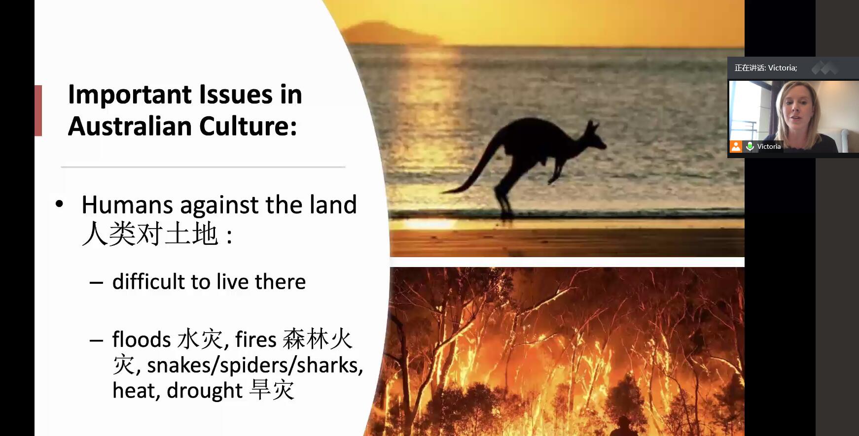 讲座通过腾讯会议平台开展,Victoria老师结合自身经历幽默风趣地描述澳大利亚的历史文化和人文风情。同学们积极与老师互动,讲座现场氛围热烈。