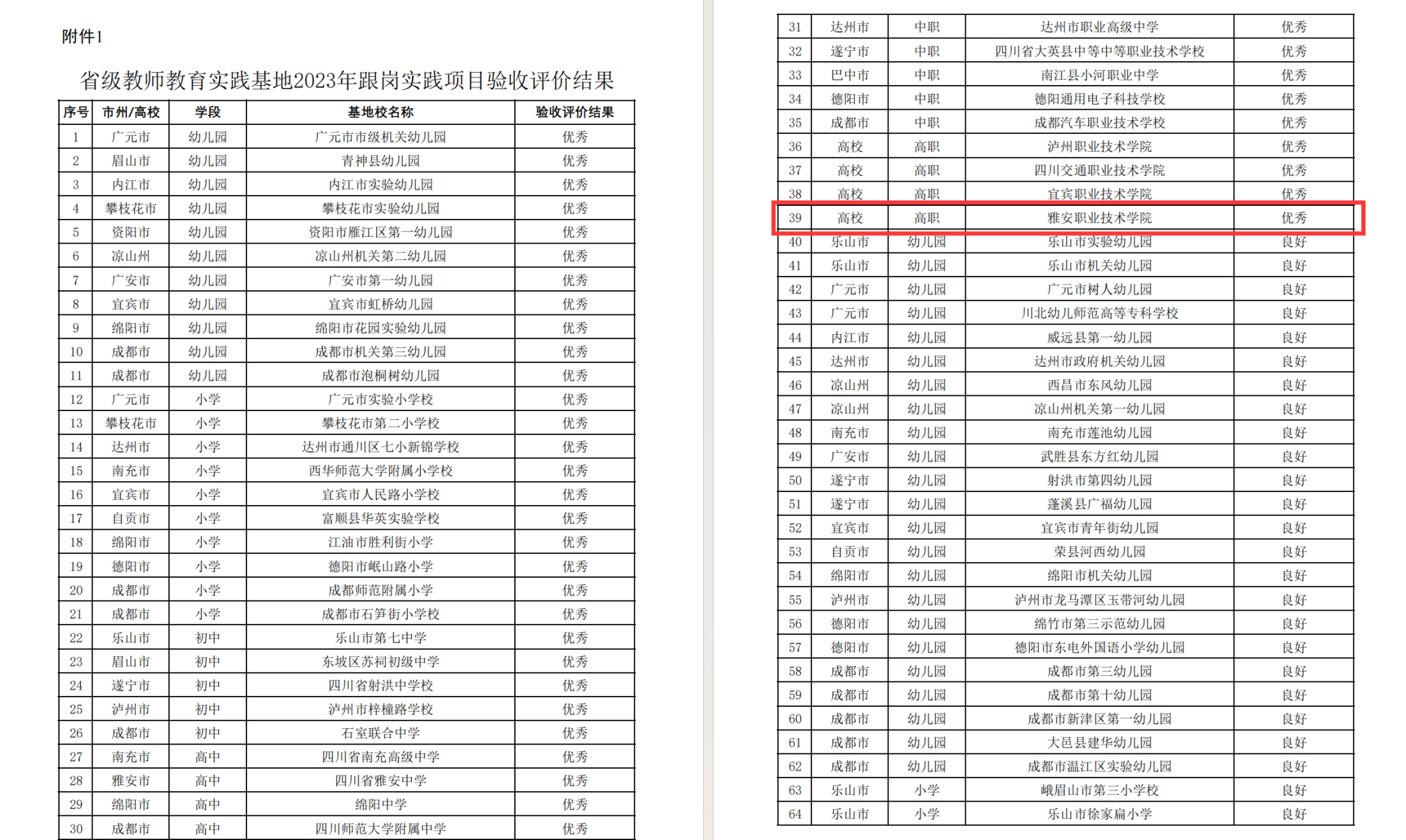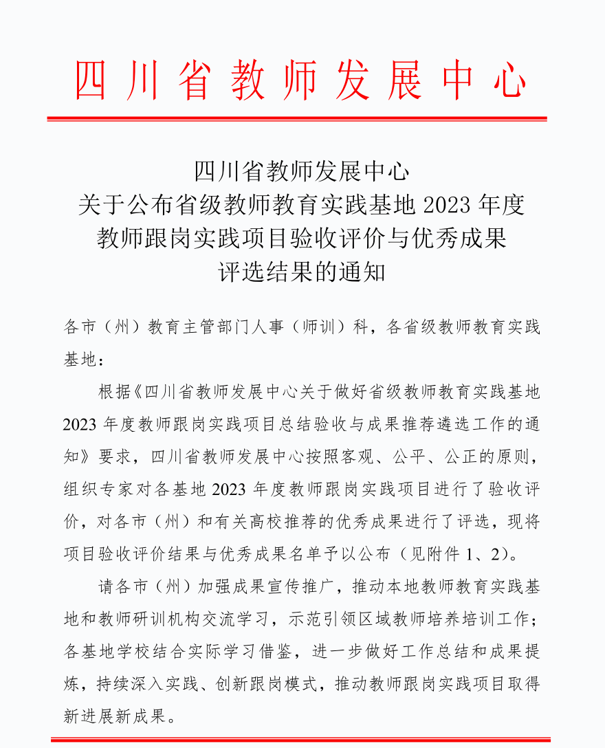近日,在四川省教师发展中心公布的省级教师教育实践基地 2023年度教师跟岗实践项目验收评审中,我校师范学院所承接的幼儿教师跟岗实践项目从165个参训项目中脱颖而出,荣获“优秀”等级。