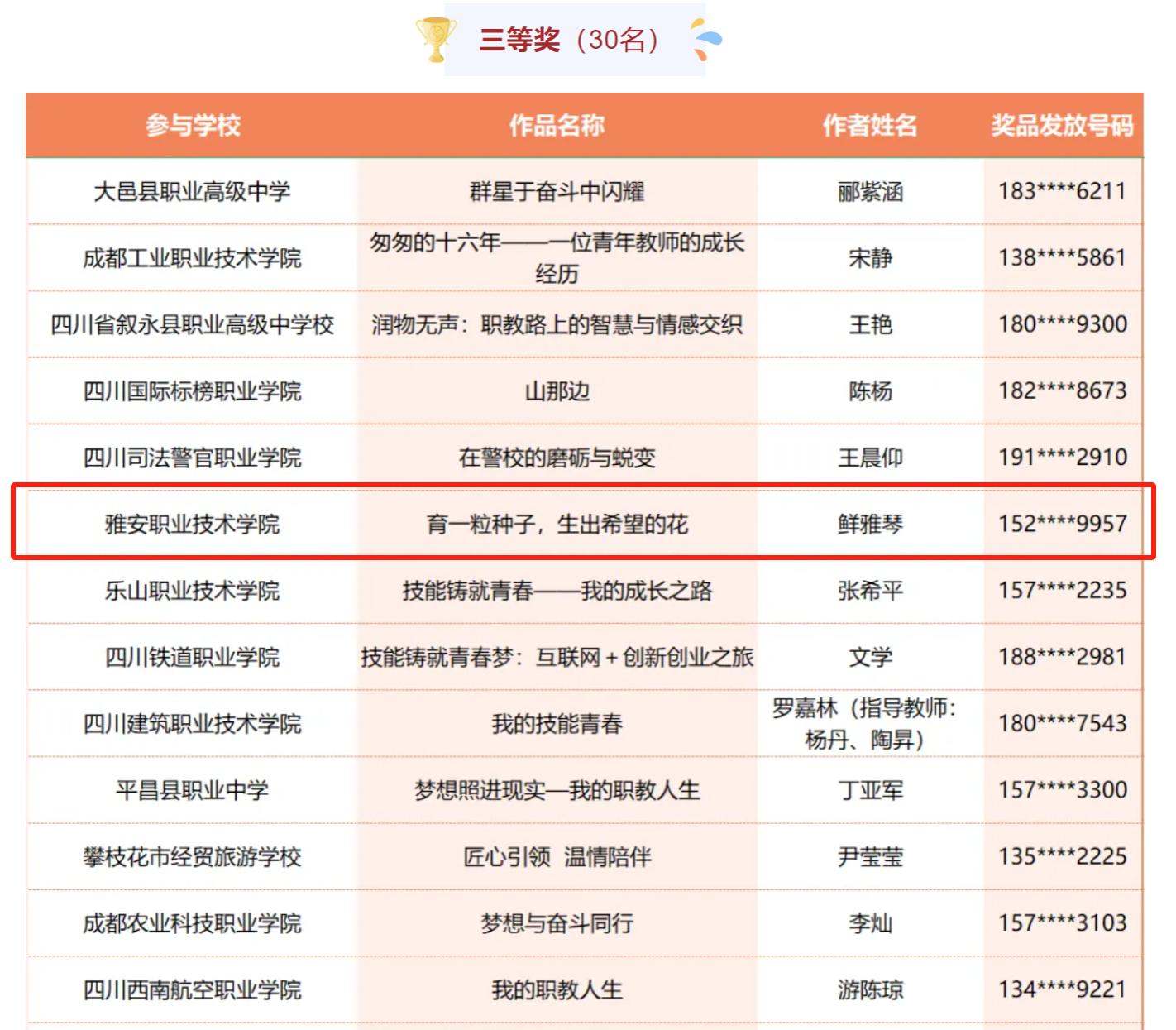 在“我的职教故事”微电影(短视频)作品征集活动中,我校亦成绩斐然。经过初审、复审以及专家评审,全省共有45部作品获得奖项。我校作品《针砭妙手除顽疾 厚爱仁心写不凡》荣获二等奖,《我在雅职的这六年》、《职教之星,闪耀前行》、《我的职教青春—职教路上的追梦人》三部作品荣获三等奖。